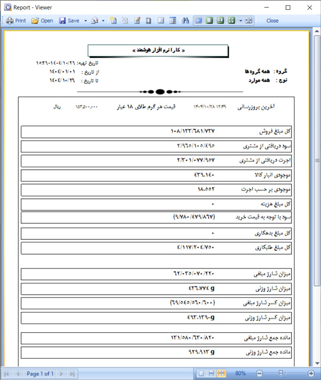 نرم افزار حسابداری و فروش طلا کارا مناسب برای استفاده در انواع طلا فروشی ها و نقره و بدلیجات و فروش سکه می باشد در نرم افزار زرگری کارا امکاناتی برای بروز رسانی مداوم تمامی اجناس بر حسب قیمت پایه و همچنین چاپ بارکد های مناسب و نگینی برای انواع محصولات مرتبط تعبیه گردیده است. کاربری اسان و بدون نیاز به دانش حسابداری از ویژگی های برنامه فروش طلا کارا می باشد همچنین امکان صدور انواع فاکتور در سایز ها و مدل های مختلف در نرم افزار موجود می باشد و قابلیت سفارشی سازی در ظاهر فاکتور و همچنین در همه بخش های نرم افزار وجود دارد.